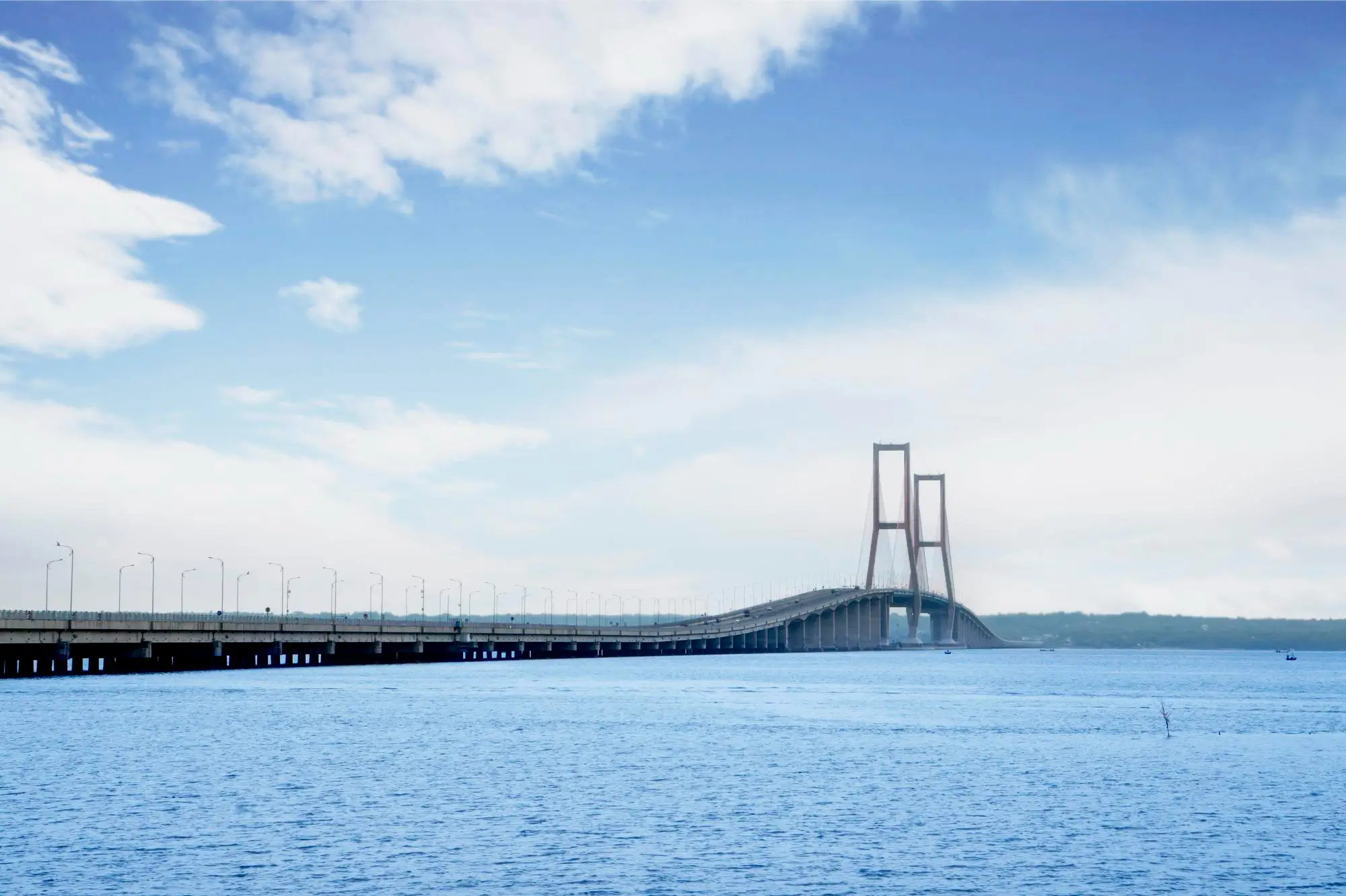 Jambatan terpanjang Indonesia menghubungkan Surabaya dan Madura merentasi Selat Madura.